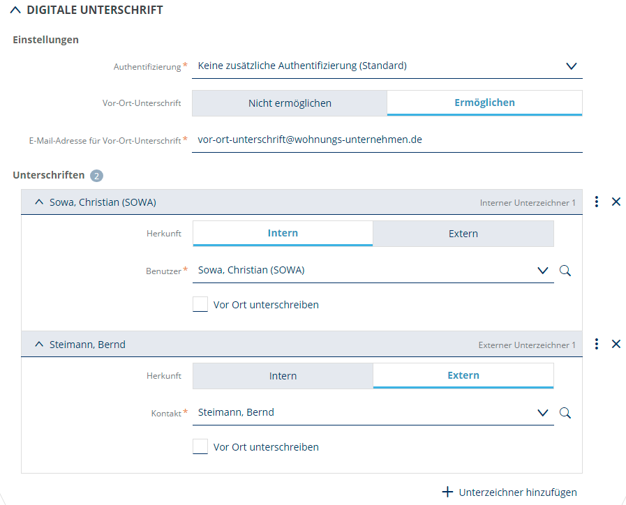 3. Klicken Sie in die Checkbox **Vor Ort unterschreiben** für die Unterzeichner die vor Ort unterschreiben sollen