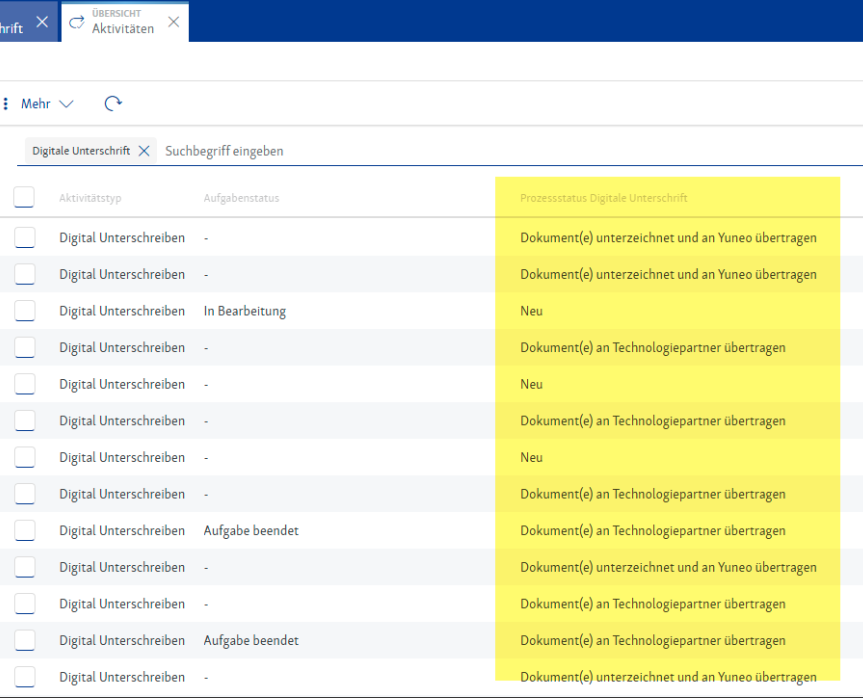 <figure><img src="https://1268406126-files.gitbook.io/~/files/v0/b/gitbook-x-prod.appspot.com/o/spaces%2FZNDqr0C0ux1sRGB739zN%2Fuploads%2FSOMlDYsgH4i0Cv9ThLBm%2Fimage.png?alt=media&#x26;token=1c9054c9-f329-4c57-af01-bedf580f1335" alt=""><figcaption><p>Aktivitäten Übersicht mit Unterzeichnungsstatus</p></figcaption></figure>
