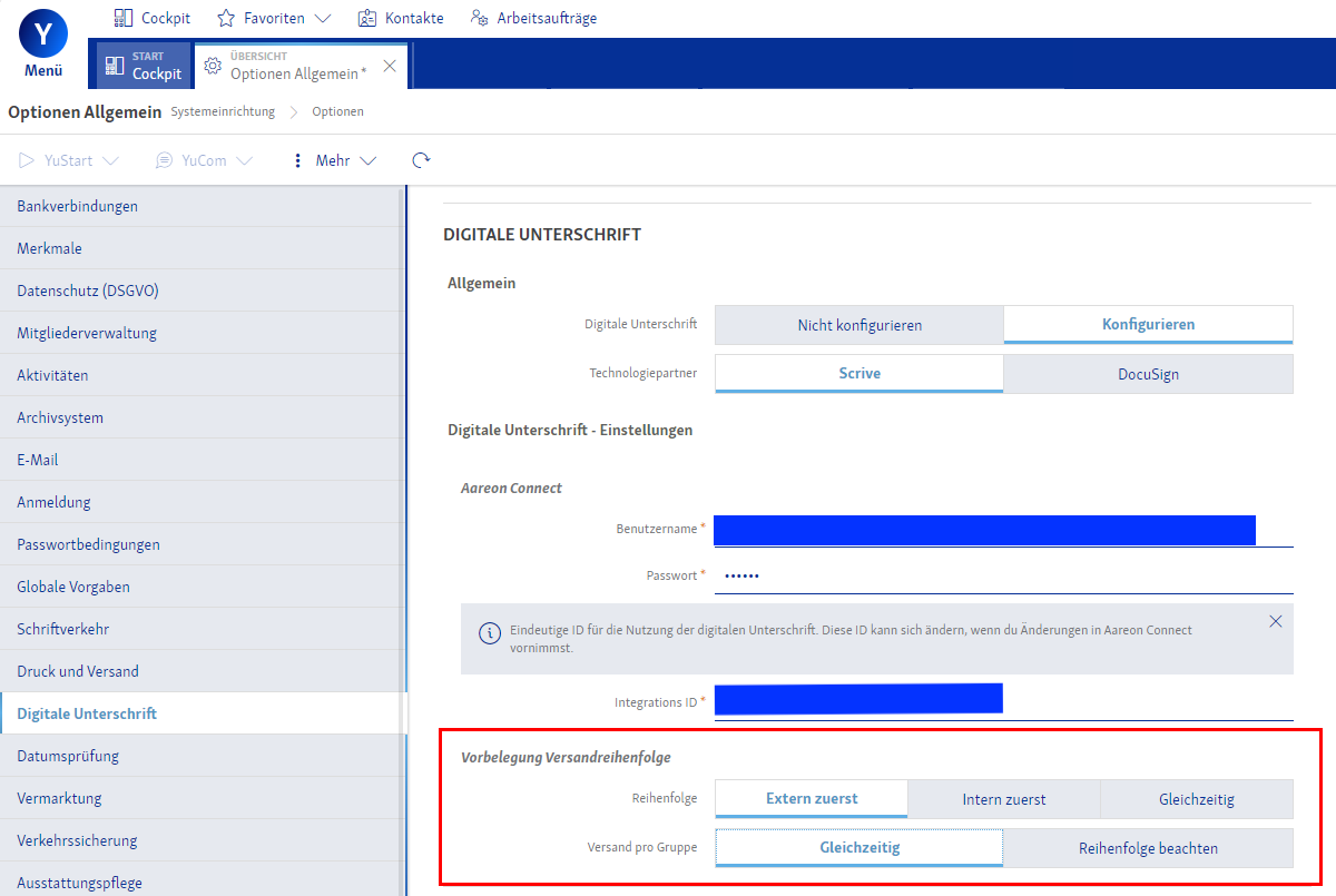5. Unter der Integrations-ID können Sie bei **Vorbelegung Versandreihenfolge** die standard **Reihenfolge** nach Unterzeichner Gruppe (Intern und Extern) bestimmen, in der die Vertragsparteien unterzeichnen sollen.\