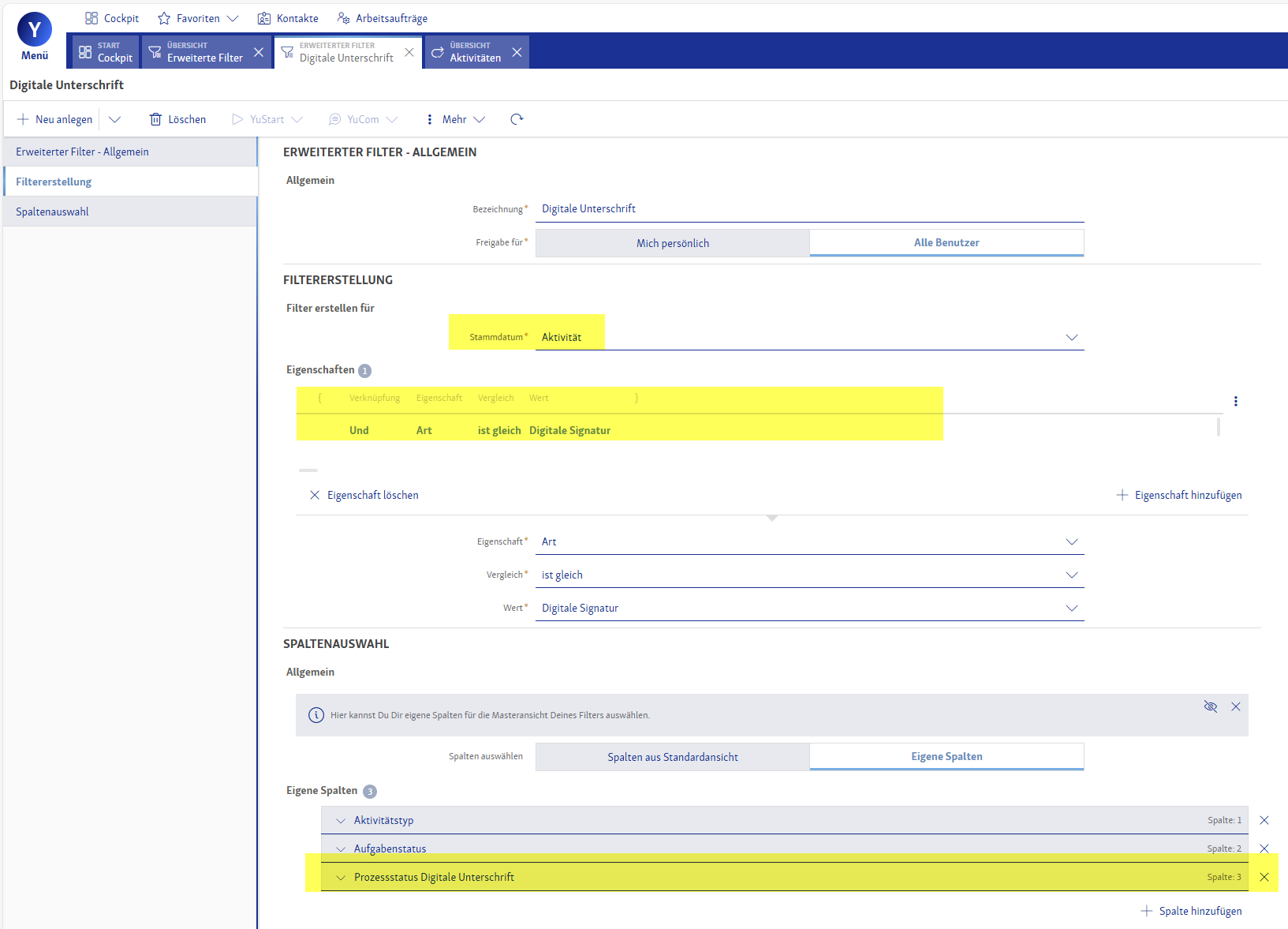 Zusätzlich können Sie sich einen Filter in der Aktivitäten Übersicht erstellen, sodass Sie den jeweiligen Unterzeichnungsstatus auf einen Blick sehen können: